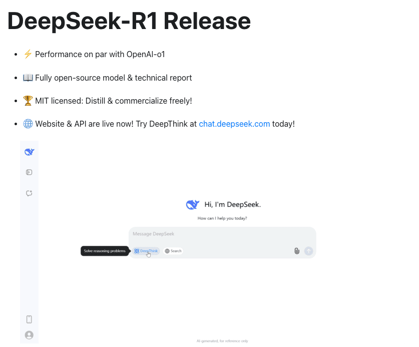 - 멀티모달 지원: DeepSeek R1은 DALL-E처럼 텍스트에서 이미지를 생성하는 기능을 제공하지만, 지역적이고 문화적인 특성을 반영한 결과물을 생성하는 데 더 적합합니다.